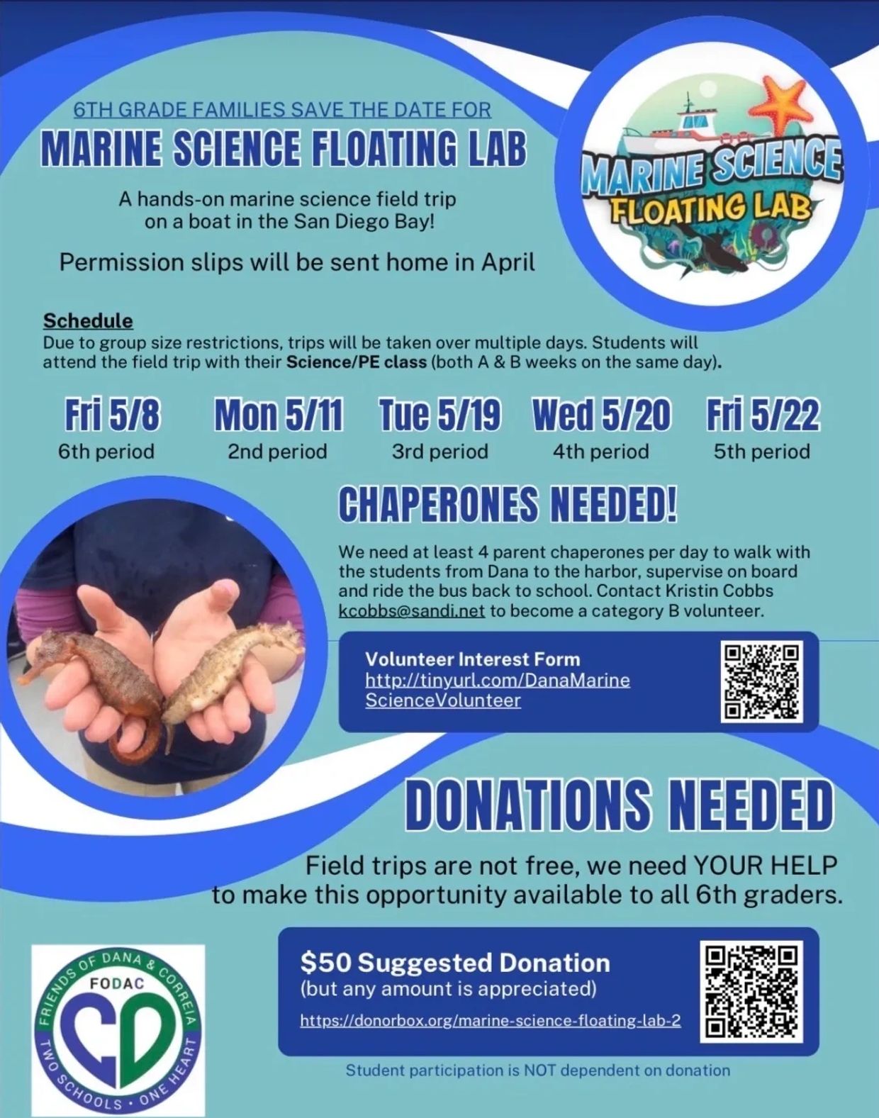 a field trip to the Marine Science Floating Lab. All students (in good standing) will be able to attend this half-day experience conducted in the San Diego Bay on a boat outfitted with oceanographic equipment specifically for student use. All marine science activities incorporate major components of the state science framework.